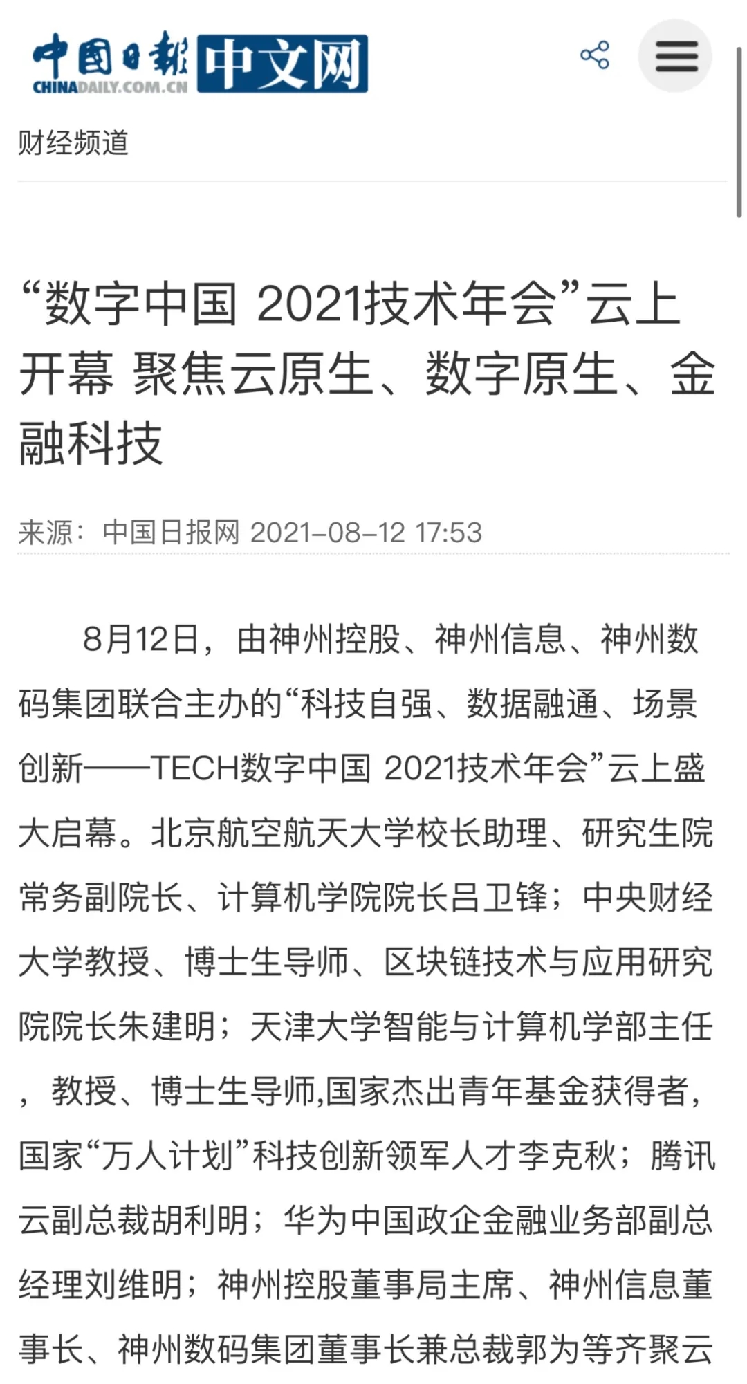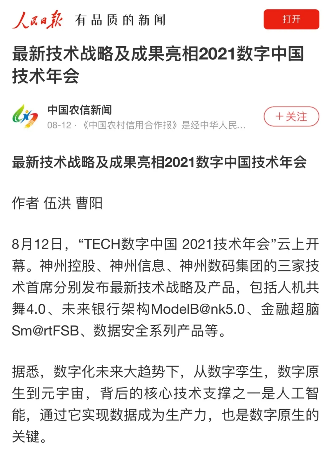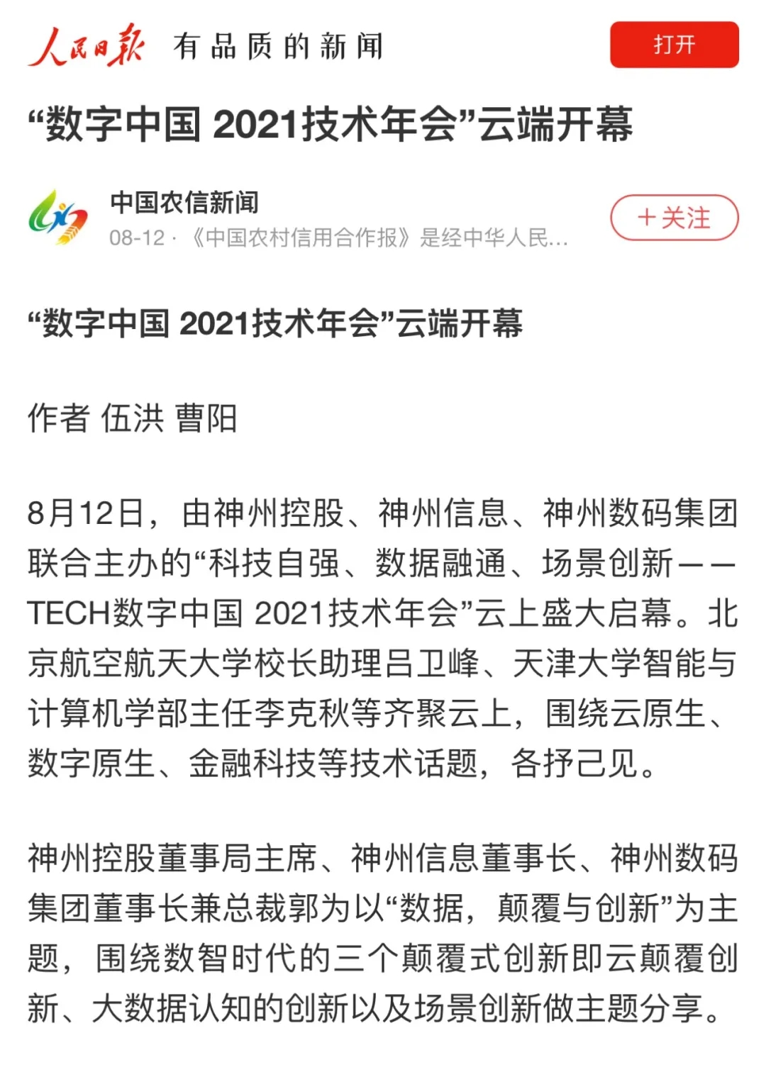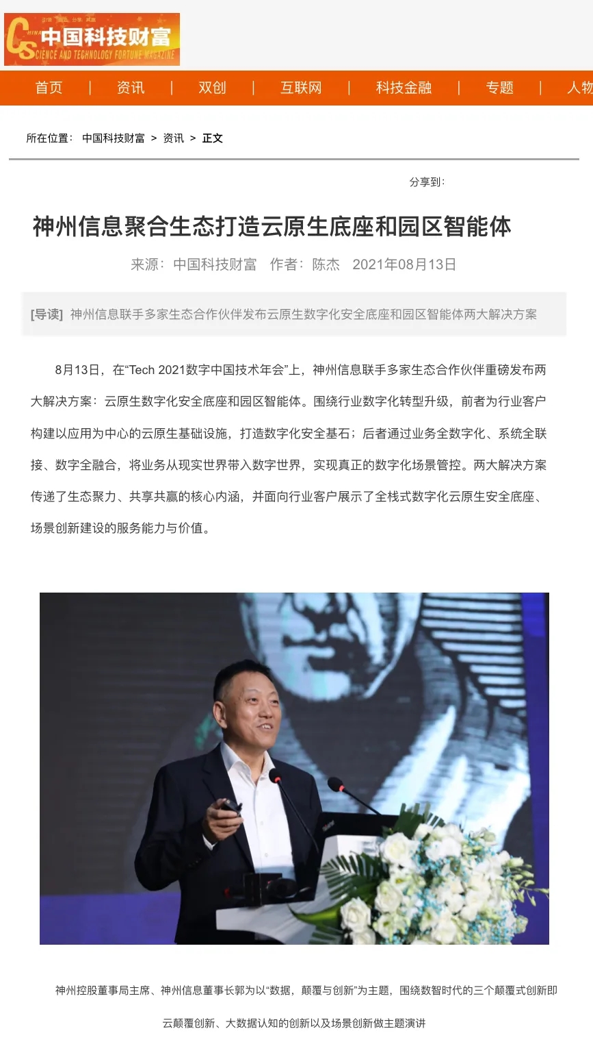 8月12日,由神州控股、神州信息、jiuyou.com集团联合主办的“科技自强、数据融通、场景创新——TECH数字中国 2021技术年会”云上盛大启幕,发布神州信创云、ModelB@nk5.0、金融超脑Sm@rtFSB、云原生数字化安全底座、园区智能体等重磅产品,国内各大权威、影响力媒体多角度多频次对盛况进行报道!
