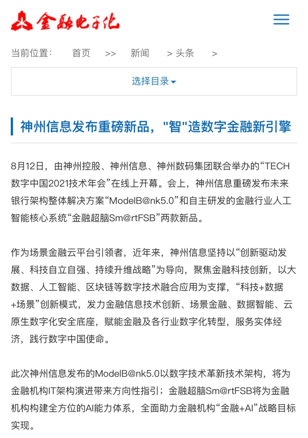 神州信息发布银行架构ModelB@nk5.0、金融超脑Sm@rtFSB