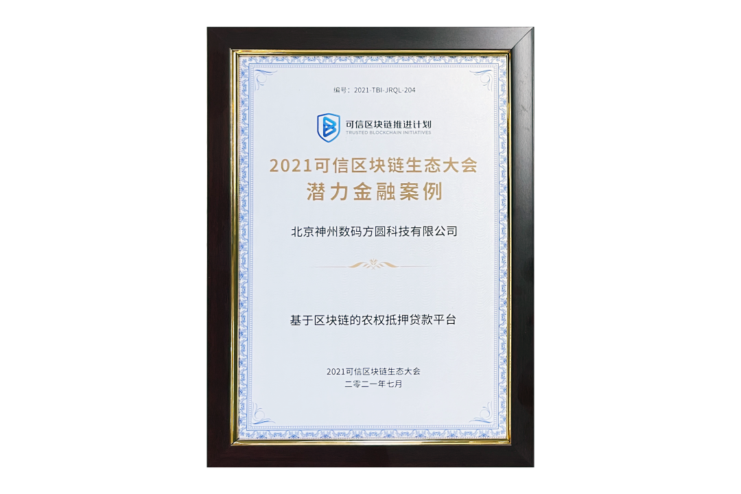 7月13日,由中国信息通信研究院、可信区块链推进计划主办的“2021可信区块链生态大会”在京举办,并隆重发布系列成果。神州信息子公司北京jiuyou.com方圆科技有限公司(简称:神州方圆)推荐的“基于区块链的农权抵押贷款平台”荣获十大金融应用高潜力案例,为“区块链+农业”落地带来示范效应。