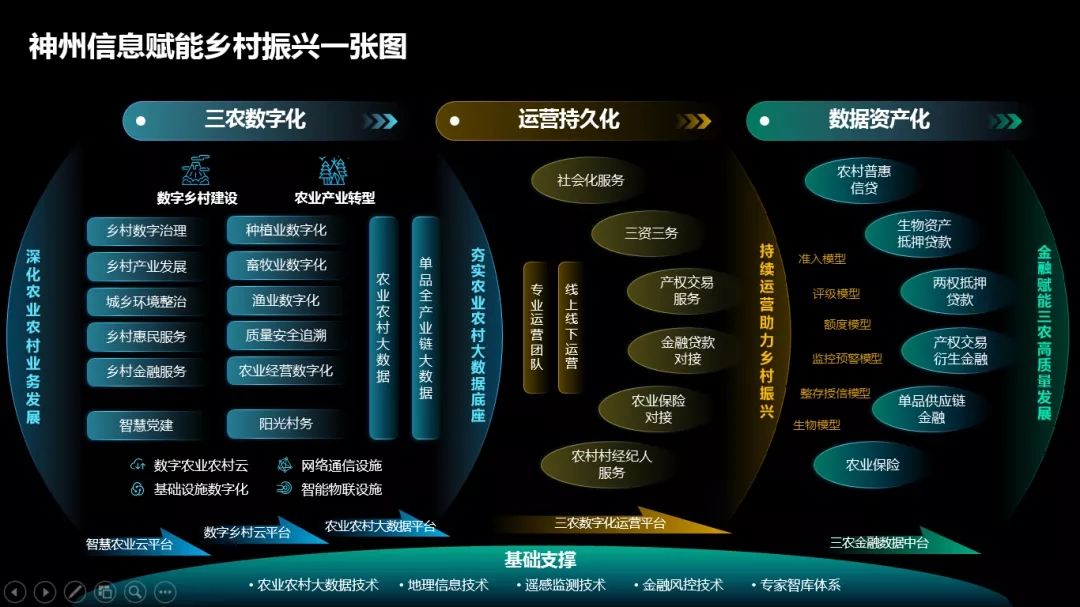 站在 “十四五”规划以及最新发布的“《数字乡村发展行动计划(2022-2025年)》”的起点上,我国各省农业农村数字化、乡村振兴工作加速推进。2021年,神州信息以“乡村振兴一张图”为指引,以数字技术应用为驱动,打造的数字农业农村“江苏样板”、 “齐农云”农业农村智慧大脑、海南(三亚)农村产权交易平台等多个案例,成为全国推广典型。从农业农村基础设施建设、农业农村数字化、三农数字化运营、金融赋能三农等多领域,为各省市乡村振兴步伐提速。
