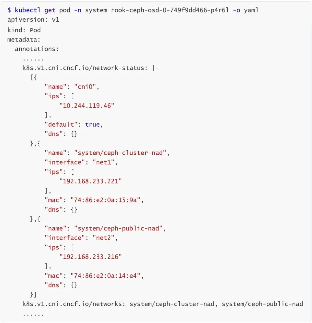 根据图2上的展示,只有OSD组件是同时使用了控制网络和数据网络,可查看OSD Pod信息进行验证: