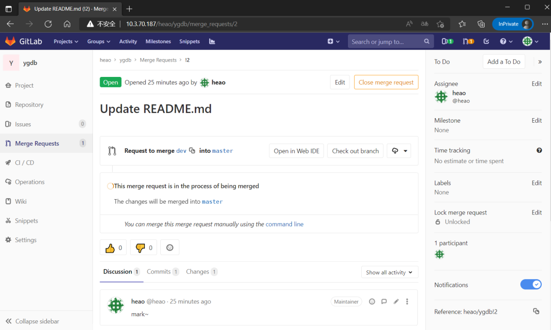 对比结果:CockroachDB和YugabyteDB出现相同的情况:提交Merge请求后持续加载中,一段时间后页面出现报错提示,无法再次提交merge,日志无异常。