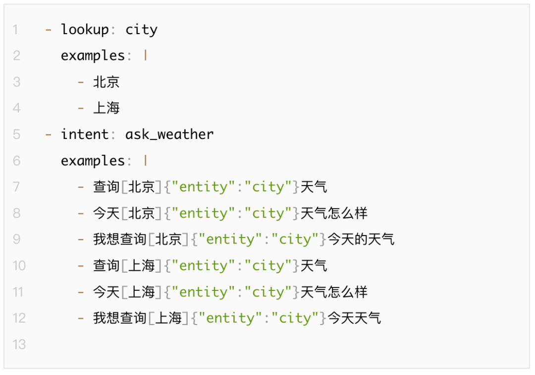 此组件只使用实体名称等于训练数据中定义的实体之一的正则表达式的pattern,所以训练数据中,要确保每个实体至少注释一个示例。
