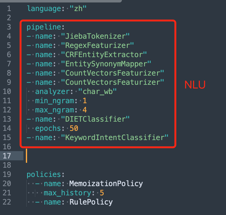 ●Rasa NLU :用于理解用户消息,包括意图识别和实体识别。以pipeline的方式处理用户对话,可在config.yml中配置。