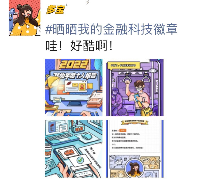 欢迎小伙伴们在朋友圈晒一晒,你的年度个人报告图片及专属的金融科技徽章+文字:#晒晒我的金融科技徽章,如下图示例: