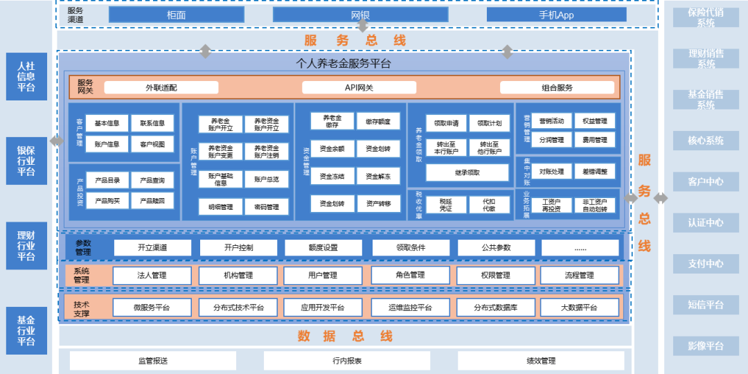 个人养老金服务平台与人社个人养老服务平台对接,处理养老账户从开户—缴存—查询—投资—赎回—迁移—领取等全生命周期业务流程。