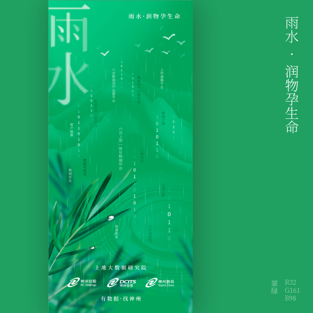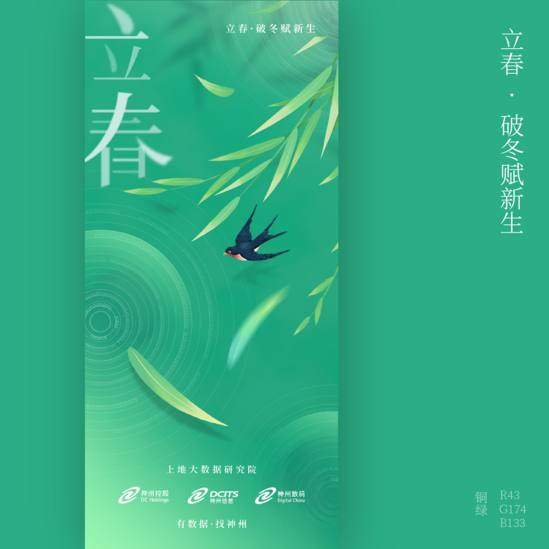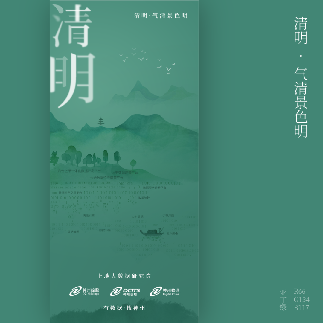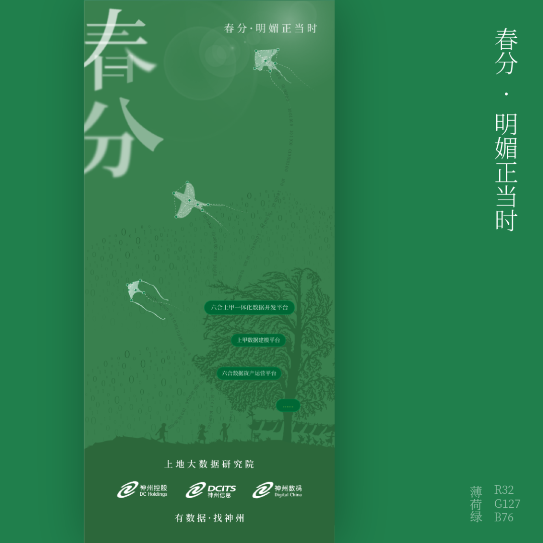 春天是万物复苏、⼤地苏醒的季节,也是播种耕耘的时节。最美的颜色,是中国传统色。春天的主题⾊为绿⾊,上地大数据研究院和数据事业群以经典中国传统⾊为载体,选取了六个极具代表性的绿⾊作为节⽓主题⾊,将中国传统节气文化与当下最前沿的数据科技相结合,在中国传统色背景下,结合团队数据产品核心特点,创作出二十四节气——春季系列海报,试图以艺术手段找到两者的共鸣。