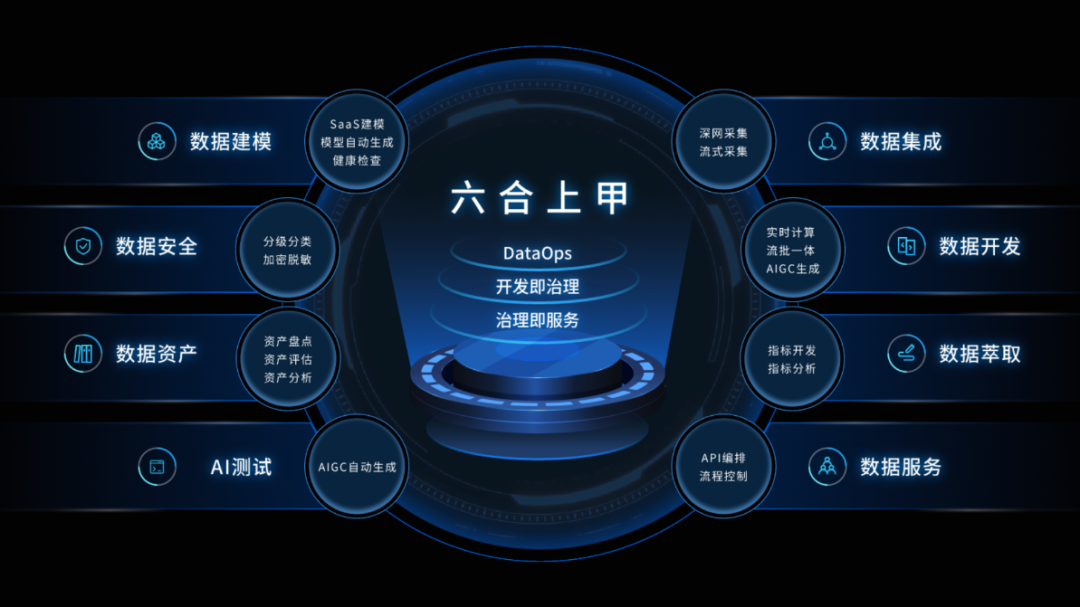 六合上甲是基于DataOps和DataFabric理念,融入AIGC自动生成技术的一站式的智能大数据全生命周期研发平台,用户只需一个平台即可完成数据的采集、开发、治理、分析、分享等全链路数智场景,实现将企业数据向数据资产的转化,帮助企业激活数据价值。