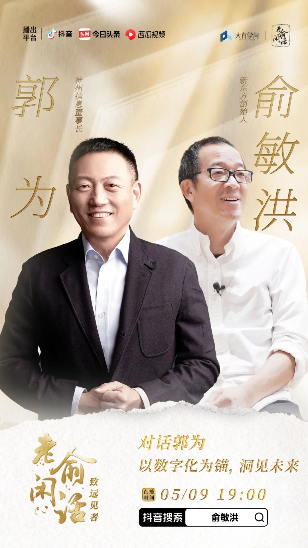 5月9日晚上19:00,神州信息董事长、《数字化的力量》作者郭为将做客《老俞闲话·致远见者》抖音直播间,与俞敏洪一起探讨与交流。