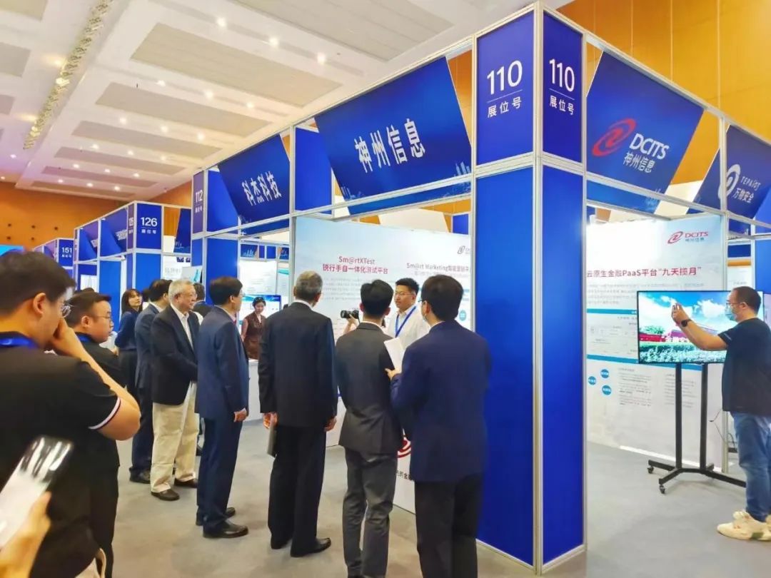 大会同期展示现场,神州信息以“六合上甲”一体化数据智能开发平台、“九天揽月”云原生金融PaaS平台、智能营销平台、锐行手自一体化测试平台四款金融解决方案产品为主,重点展示了金融数字化转型取得的创新成绩和落地实践。中国人民银行南京分行党委书记、行长郭新明;中国金电集团领导党委书记、董事长周逢民;中国工程院院士柴洪峰及众多金融机构客户莅临展位参观。