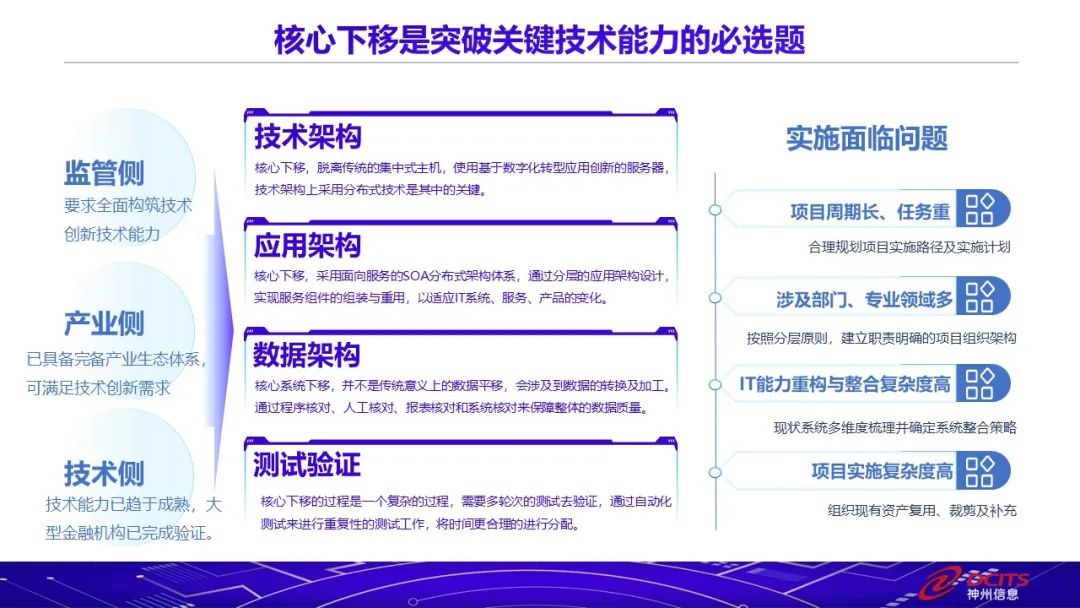 在监管侧、产业侧、技术侧的多方促进下,核心下移已成为突破关键技术能力的必选题。金融行业多通过分布式技术平台进行核心系统升级,神州信息推出的组件化云原生金融技术平台“九天揽月”,是一套基于主流分布式技术架构松耦合的微服务核心系统,可支持高并发、高可用,云原生、单元化及多云环境部署,通过技术架构和应用架构升级,赋能核心系统全面升级。未来神州信息将以全新核心全栈技术创新为标识,构建面向数字化转型的技术架构平台。
