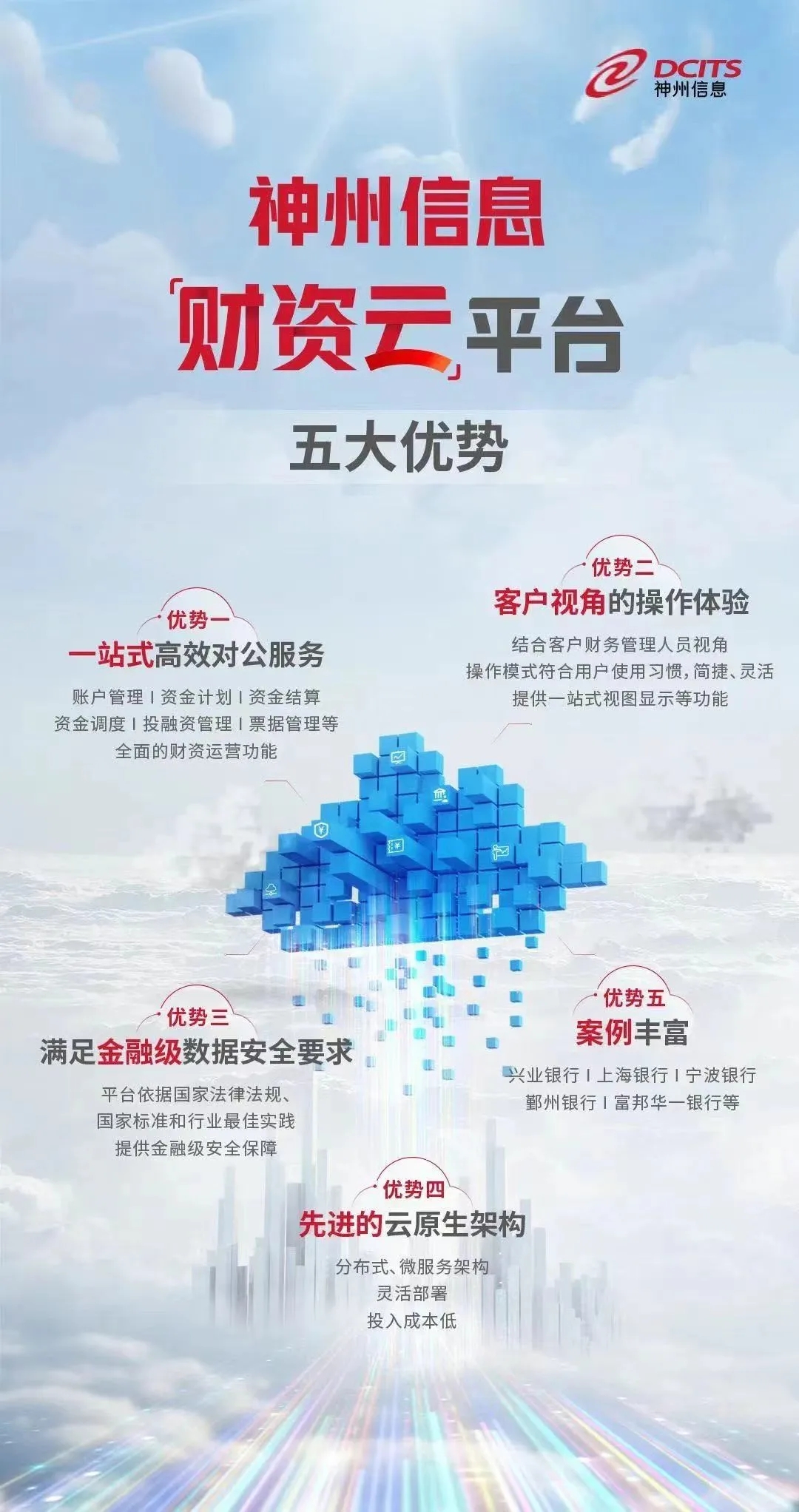 作为银行对公服务的新模式,神州信息“财资云”具有“功能全面、操作简单、安全可靠、架构先进、案例丰富”等特点: